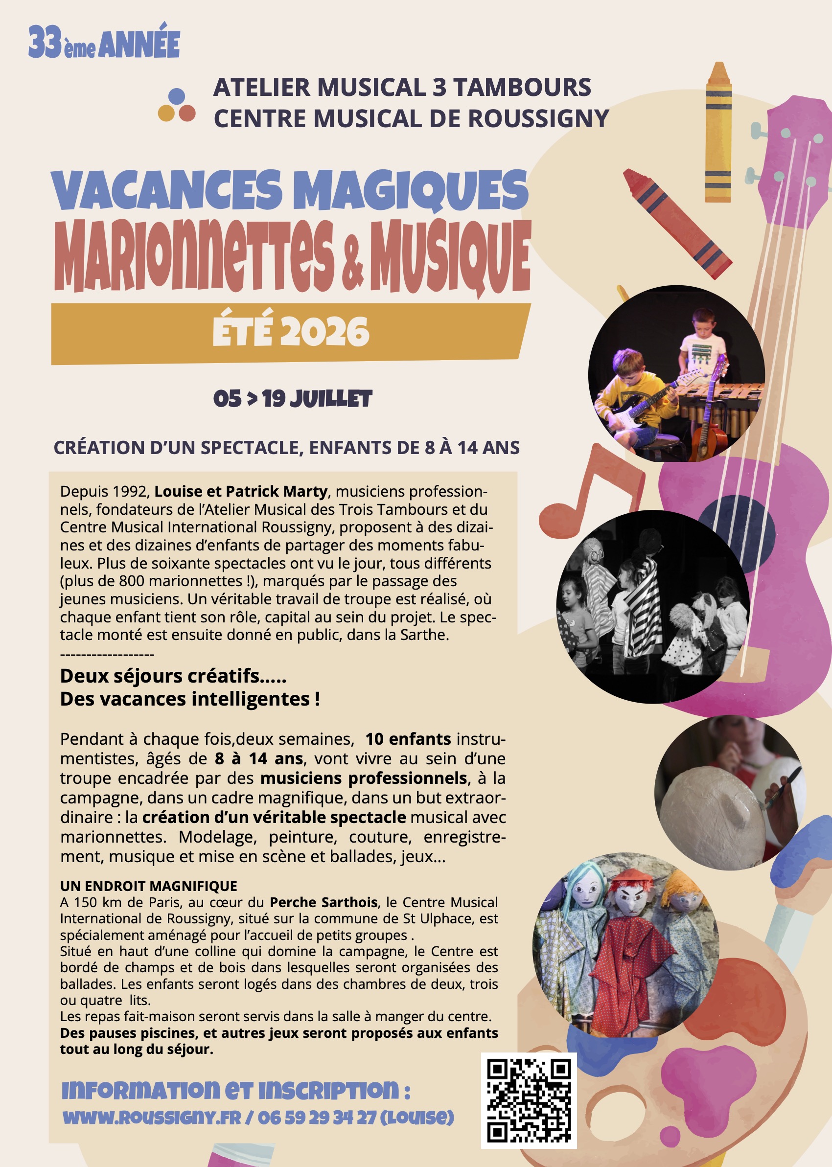 Depuis plus de 30 ans, Louise et Patrick MARTY organisent des ateliers de création de spectacles Musicaux avec des Marionnettes avec des enfants musiciens de 08 à 14 ans.